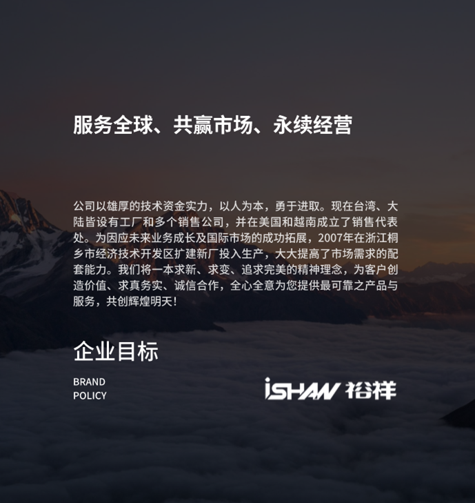 公司以雄厚的技術資金實力,以人為本,勇于進取。現在臺灣、大陸皆設有工廠和多個銷售公司,并在美國和越南成立了銷售代表處。為因應未來業(yè)務成長及國際市場的成功拓展,2007年在浙江桐鄉市經濟技術開發(fā)區(qū)擴建新廠投入生產,大大提高了市場需求的配套能力。我們將一本求新、求變、追求完美的精神理念,為客戶創(chuàng)造價值、求真務實、誠信合作,全心全意為您提供最可靠之產品與服務,共創(chuàng)輝煌明天!